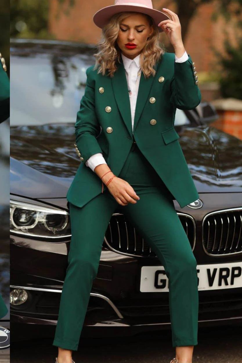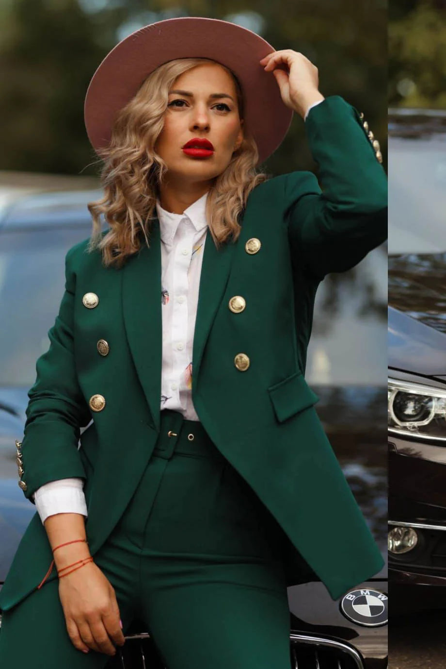 Impuneți-vă stilul cu acest costum office clasic, dar modern! Croiala tip power-suit, cu sacou cambrat, la două rânduri de nasturi aurii, și pantaloni conici, vă oferă o prezență profesională impecabilă.