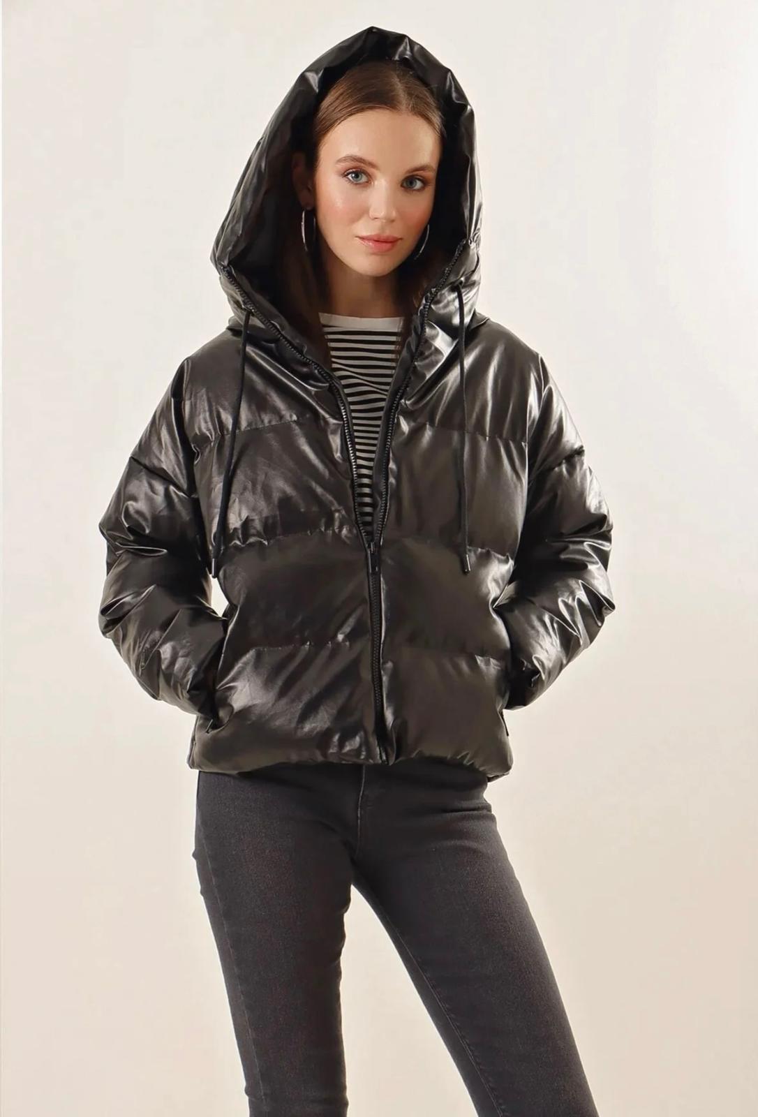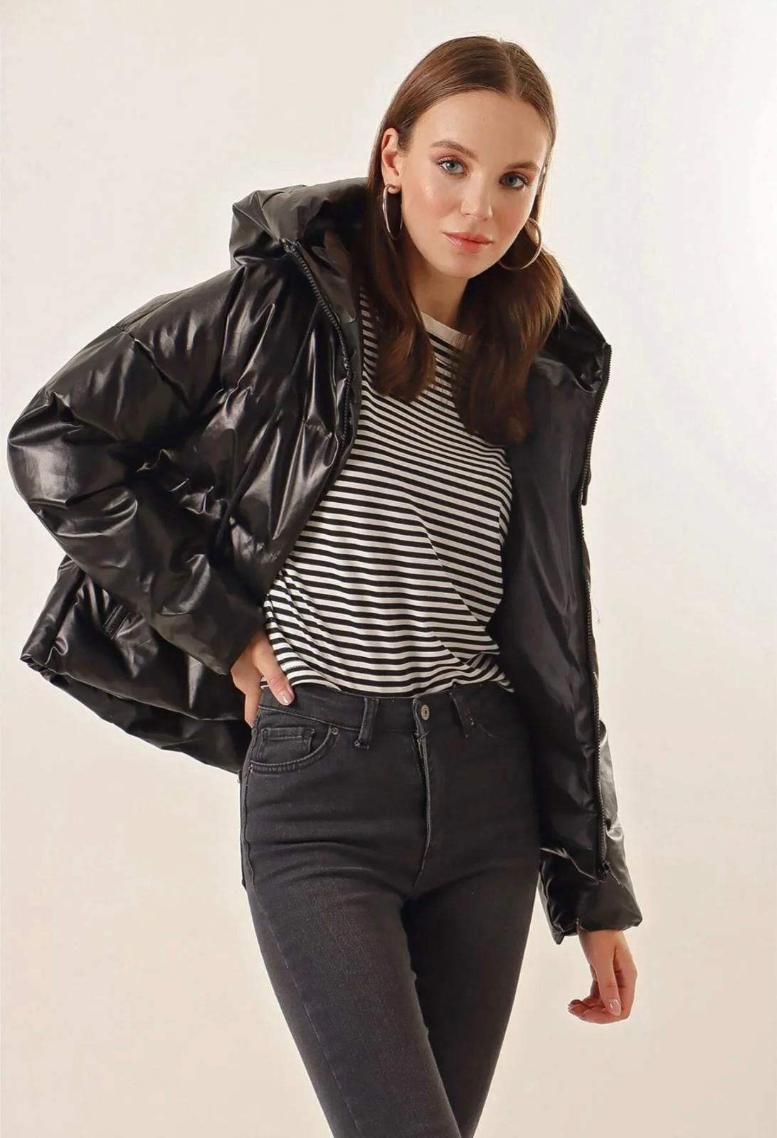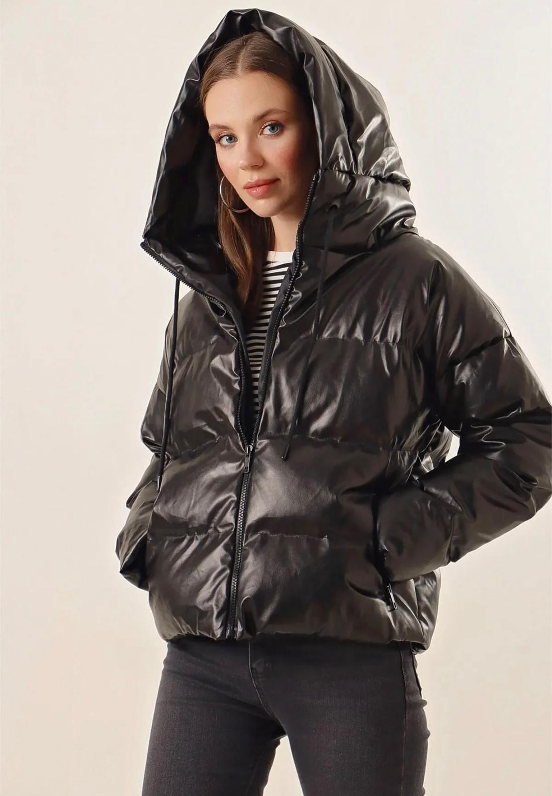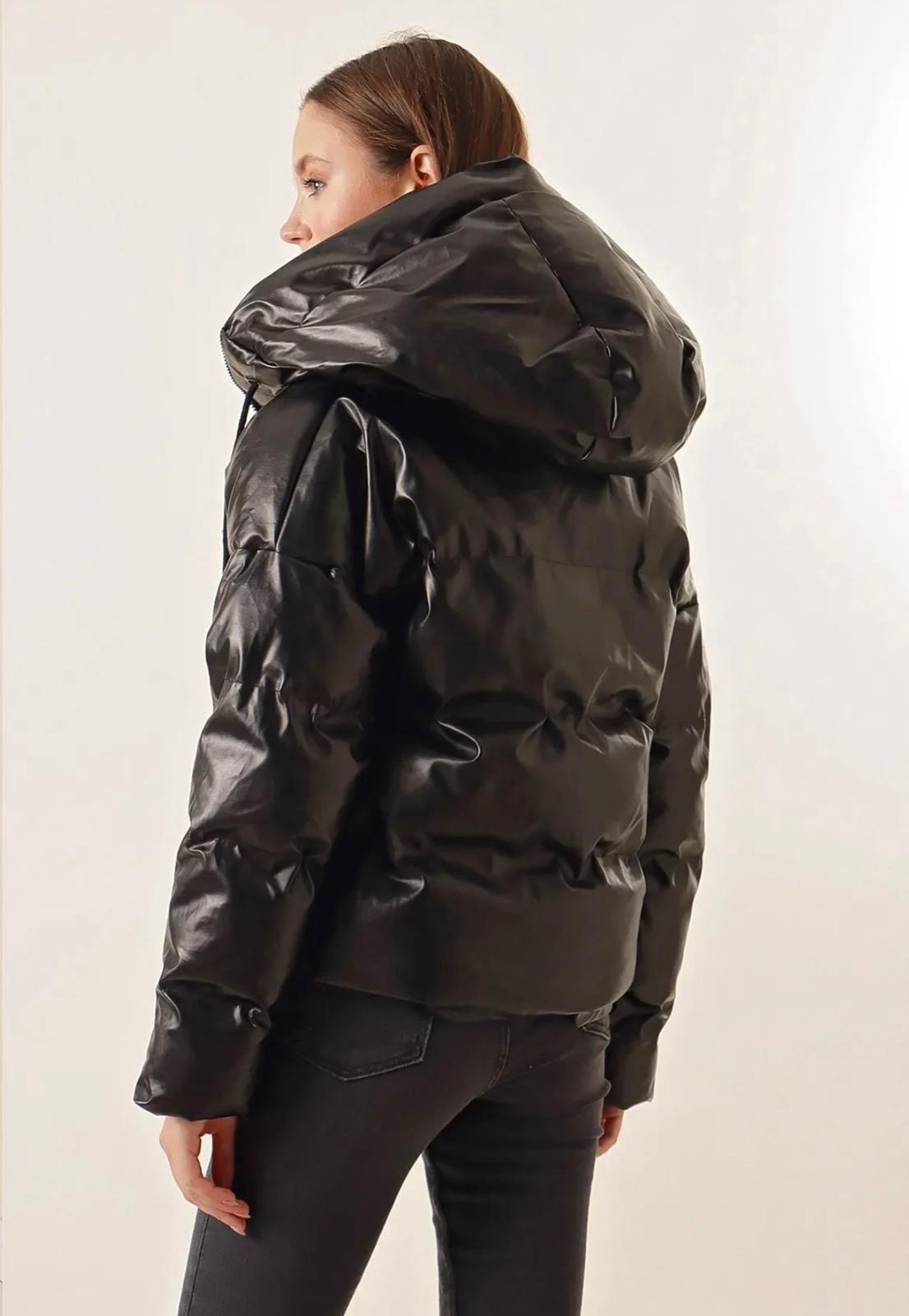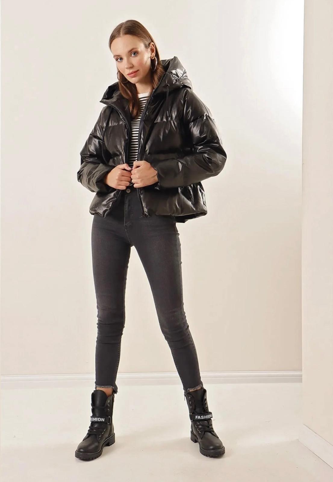 Stil: Look streetwear, edgy și modern, perfect pentru a te proteja de frig cu stil. Se remarcă prin finisajul lucios (wet-look) care adaugă o notă glam unei piese sport. Croiala voluminoasă este în trend, fiind ideală de purtat cu blugi skinny sau wide-leg și cizme groase.