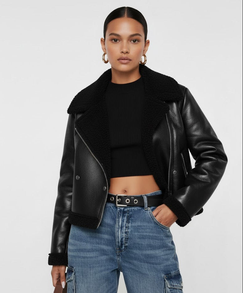 Stil: Look edgy, urban și statement, perfect pentru a crea ținute cu atitudine în sezonul rece. Designul combină aspectul dur al pielii ecologice cu senzația moale a căptușelii din blană sintetică tip shearling (sau teddy). Este ideală pentru a fi purtată cu blugi, pantaloni cargo sau fuste mini.